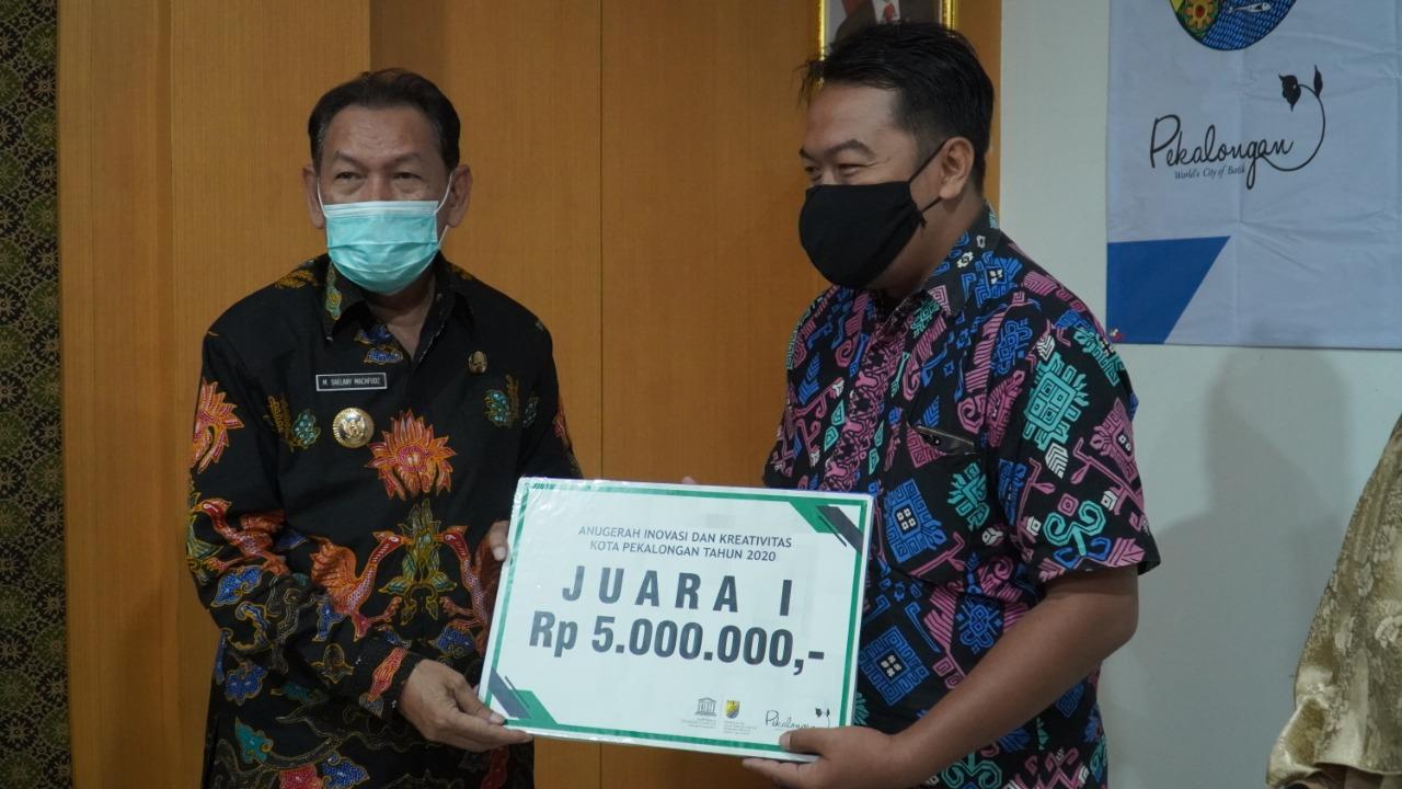 Wali Kota Pekalongan H M Saelany Machfudz, SE menyerahkan penghargaan Kreativitas dan Inovasi Masyarakat (Krenova) 2020 kepada masyarakat Kota Pekalongan yang telah menghasilkan/melakukan penemuan atas suatu produk inovasi kepada lima pemenang di Ruang Kalijaga Setda setempat, Kamis (5/11/2020).